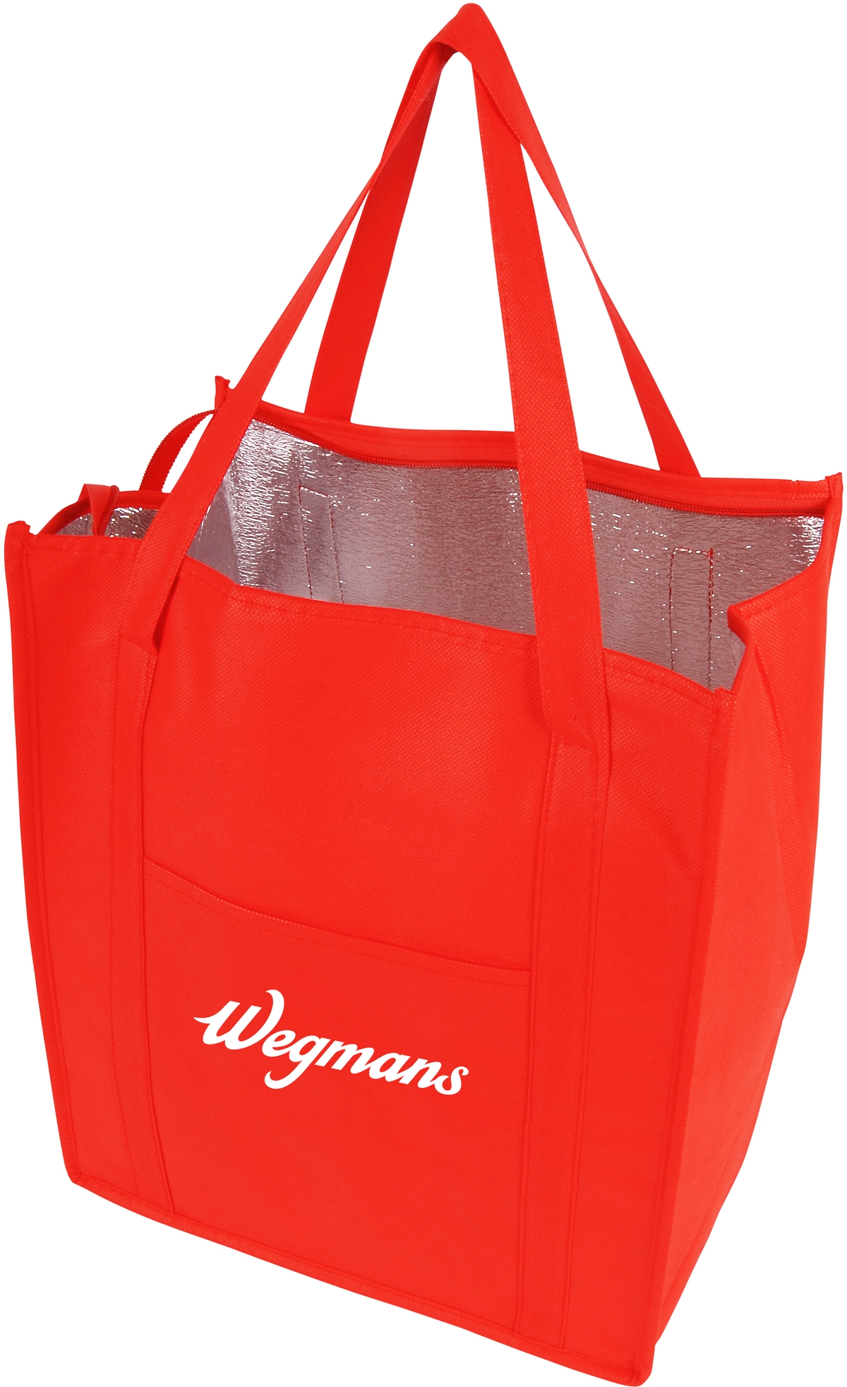 | Description | Thermal food grocery safe foil interior, front pocket, zippered closure, 22" reinforced handles. 235 GSM non-woven polypropylene. |
