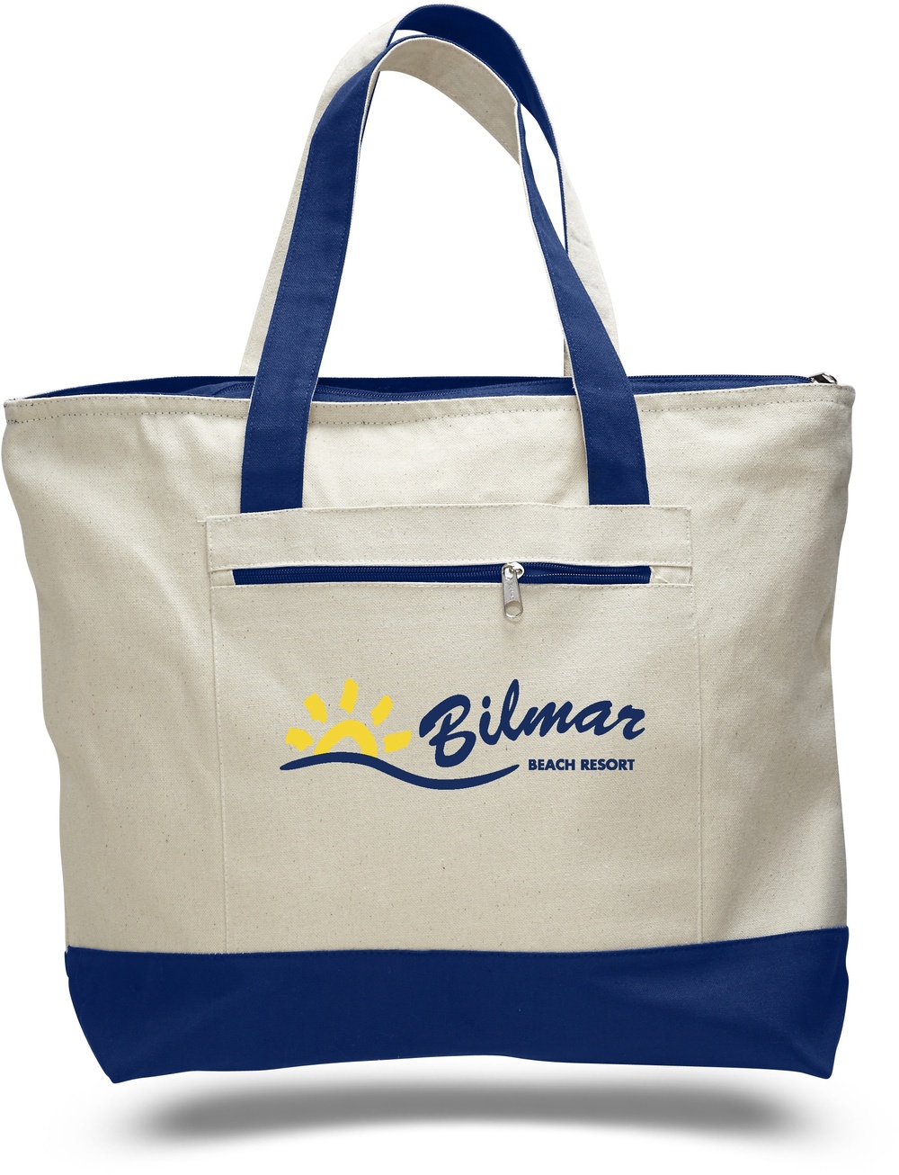 | Description | 12 oz. Cotton canvas zipper tote bag with colored 22" handles, exterior zippered pocket, with a bottom gusset.